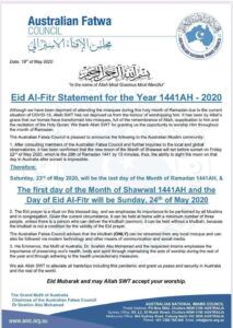 آسٹریلوی فتویٰ کونسل نے اعلان کیا ہے کہ آسٹریلیا میں عید 24 مئی کو ہوگی۔ آسٹریلیا فتویٰ کونسل کے اراکین اور دیگر مقامی افراد کے اجلاس میں بتایا ہے کہ 23 مئی ہفتہ کی شب شوال کا چاند نظرآجائے گا اوراتوار24مئی کو عید ہوگی۔اس سال آسٹریلیا میں 29 روزے ہوں گے۔
