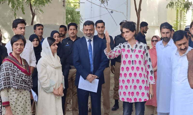 کراچی میں ملالہ یوسف زئی کا عزیز آباد میں قائم گورنمنٹ ایلمنٹری کالج کا دورہ،ملالہ یوسف زئی کے ہمراہ گلوکار شہزاد رائے و دیگر شخصیات نےبھی شرکت کی۔