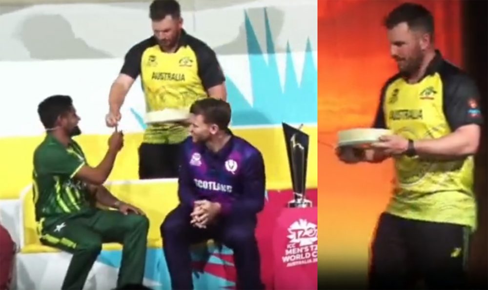 جیسے ہی پریس کانفرنس ختم ہوئی تو تمام کپتانوں کو انتظار کرنے کو کہا گیا اور اس دوران آسٹریلوی کپتان ایرون فنچ ’برتھ ڈے کیک‘ لے کر اسٹیج پر آئے اور بابر اعظم کو پیش کیا۔