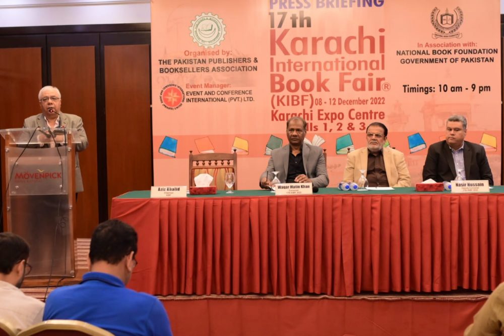 کراچی انٹر نیشنل بک فیئر کے کنوینئر وقار متین نے پاکستان پبلشرز اور بک سیلرز ایسوسی ایشن کے چیئرمین عزیز خالد کے ہمراہ منگل کے روز مقامی ہوٹل میں پریس کانفرنس میں صحافیوں کو عالمی میلے کی تفصیلات سے آگاہ کیا۔