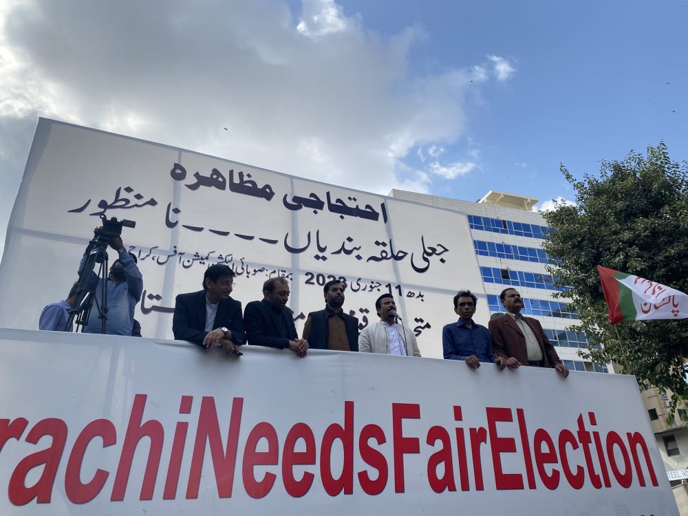 کراچی میں انتخابی حلقہ بندیوں کے خلاف متحدہ قومی موومنٹ (ایم کیو ایم) پاکستان نے الیکشن کمیشن کے دفتر کے باہر احتجاج کیا ۔ جس میں پاک سرزمین پارٹی (پی ایس پی) کے چیئرمین مصطفیٰ کمال اور تنظیم بحالی کمیٹی کے سربراہ فاروق ستار نےبھی اپنے کارکنان کے ہمراہ شرکت کی۔