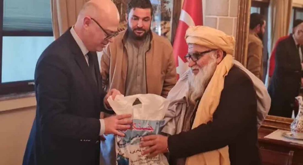 اے آر سی ایس کے صدر مولوی مطیع الحق خالص کو کابل میں ترک سفیرجہاد ایرگینے کو پلاسٹک کا تھیلا تھماتے ہوئے تصویر کھینچی گئی ہے۔