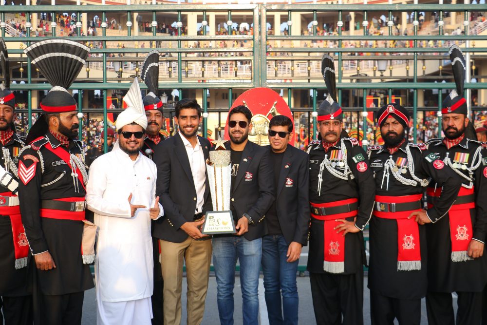لاہورقلندرز کے کھلاڑی اور ٹیم انتظامیہ ٹرافی کو لے کر لاہور میں پاکستان اور بھارت کی سرحد واہگہ بارڈر پہنچ گئے۔