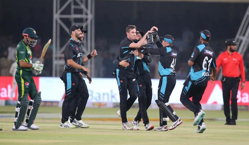 پہلی وکٹ 14کے سکور پر گری جب محمد رضوان ایل بی ڈبلیو آئوٹ ہوئے ۔ دوسرے آئوٹ ہونے بیٹسمین بابر اعظم جو 9رنز بنا کر مائن کی گیند پر بولڈ ہوگئے