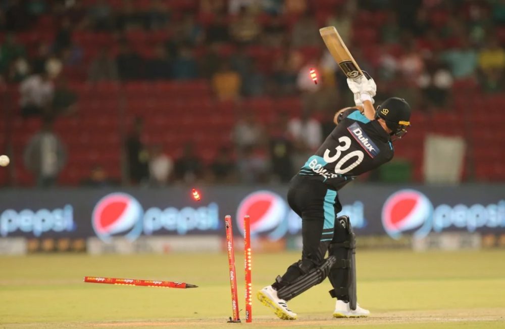 نیوزی لینڈ کی پہلی وکٹ 20 رنز کے مجموعی اسکور پر گری جب چیڈ باؤز 7رنز بنا کر آؤٹ ہوئے۔ انہیں شاہین آفریدی نے بولڈ کیا
