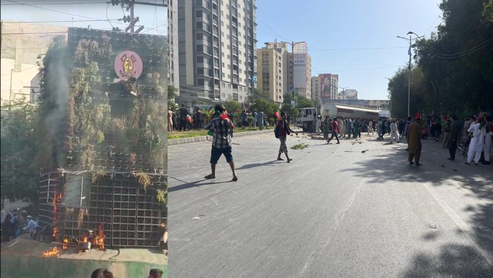 کراچی(اسٹاف رپورٹر)چیئرمین پی ٹی آئی عمران خان کی گرفتاری کے خلاف کراچی میں مشتعل مظاہرین شاہراہ فیصل نرسری پر رینجرز کی چوکی کو آگ لگادی