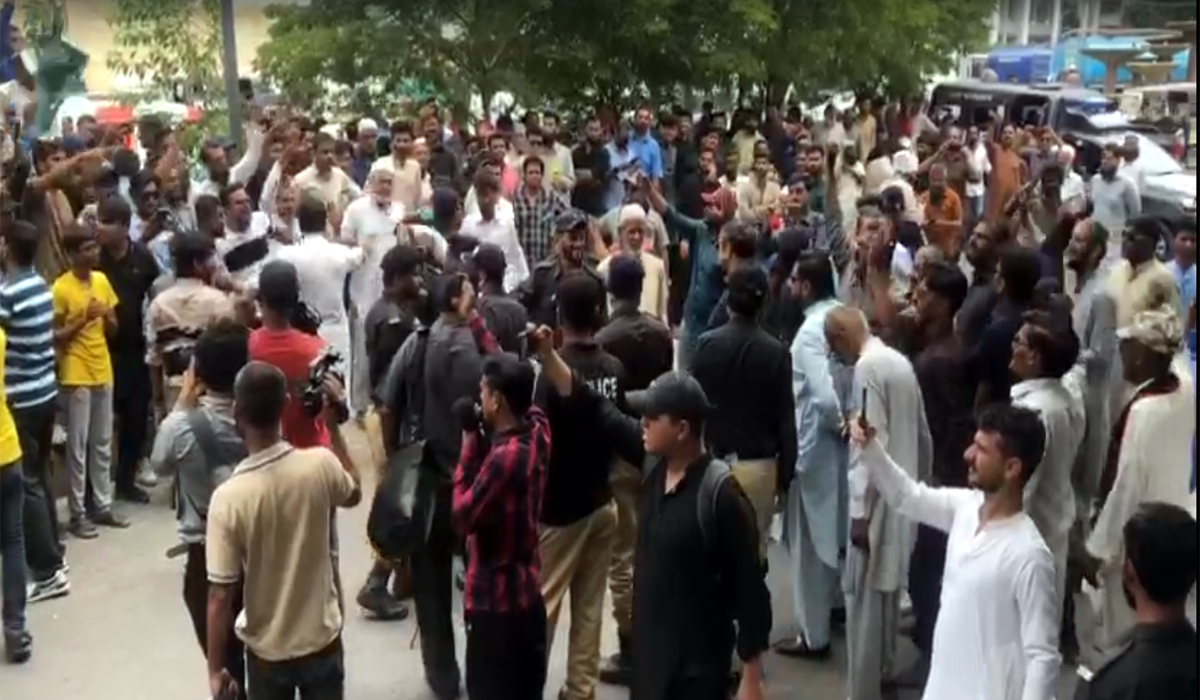 جماعت اسلامی کے کارکنان آرٹس کونسل کے مرکزی دروازے پر پہنچنے کی کوشش ۔ پولیس اہلکاروں نےجماعت اسلامی کے کارکنان کی کوشش کو ناکام بنا دیا ہے