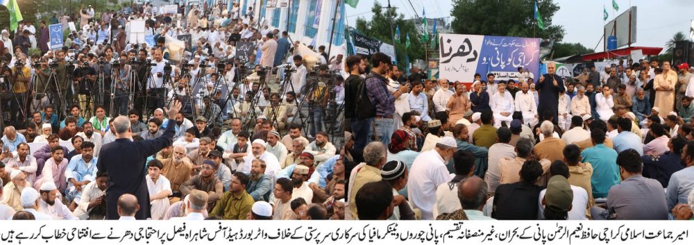 امیر جماعت اسلامی کراچی حافظ نعیم الرحمن نے دھرنے کے شرکاء سے ابتدائی خطاب کرتے ہوئے کہا کہ پیپلز پارٹی کراچی کے عوام سے سیاسی انتقام نہ لے،اہل کراچی کو پانی دیا جائے، کے فور منصوبہ، ایس تھری منصوبہ، گجر نالہ پروجیکٹس فی الفور مکمل کیے جائیں۔ پانی چوروں، ٹینکر مافیا اور غیر قانونی ہائیڈرینٹ کی سرکاری سرپرستی ختم کی جائے، اسٹیک ہولڈرز پر مشتمل اجلاس بلایا جائے اور پانی کی منصفانہ تقسیم کا سسٹم بنایا جائے۔ پیپلز پارٹی نے 15سال میں کراچی کے لیے ایک گیلن پانی کا اضافہ نہیں کیا، عبد الستار افغانی نے حب ڈیم سے کراچی کے لیے پانی کا انتظام کیا تھا پھر نعمت اللہ خان ایڈوکیٹ نے K-3منصوبہ مکمل کیا۔کے فور منصوبے کے تحت 650ملین گیلن یومیہ کراچی کو ملنا چاہیئے تھا لیکن وہ آج تک نہیں مل سکا، کے فور میں کٹوتی کر کے پانی آدھا کر دیا ہے لیکن وہ بھی تاحال مکمل نہیں کیا گیا۔کراچی میں ٹینکر مافیا بڑے زورو شور سے کام کر رہی ہے اور اس کی سرپرستی سندھ حکومت اور پیپلز پارٹی کر رہی ہے۔ پیپلز پارٹی نے کرپشن اور نا اہلی کی انتہائی کردی ہے، کراچی کی انڈسٹری کو بھی پانی جائز طریقے سے نہیں دیا جا رہا، رہائشی علاقوں کا پانی روک کر صنعتی ایریا کو دیا جارہا ہے، ہم کہتے ہیں رہائشی علاقوں اور صنعتوں کو،دونوں کو جائز طریقے سے پانی دیا جائے۔