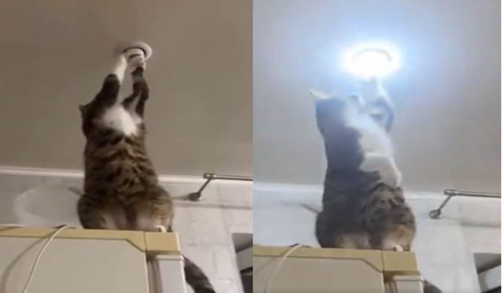 ویڈیو میں دیکھا جا سکتا ہے کہ بلی فریج پر چڑھ کر چھت کیساتھ لگے بلب کو جلانے کی کوشش کر رہی ہے، بلب کے نہ جلنے پر بلی اسے بار بار چھیڑ کر چیک کرتی ہے۔