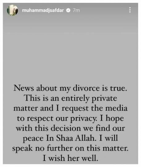 مریم نواز کے صاحبزادے نے مختصر انسٹاگرام اسٹوری میں لکھا کہ ان کی شادی طلاق پر ختم ہونے کی خبریں سچی ہیں۔انہوں نے مزید لکھا کہ طلاق ان کا ذاتی معاملہ ہے اور ساتھ ہی انہوں نے میڈیا سے درخواست کی کہ وہ ان کی شادی ختم ہونے سے متعلق خبریں دیتے وقت ان کی پرائیویسی کا خیال رکھیں۔