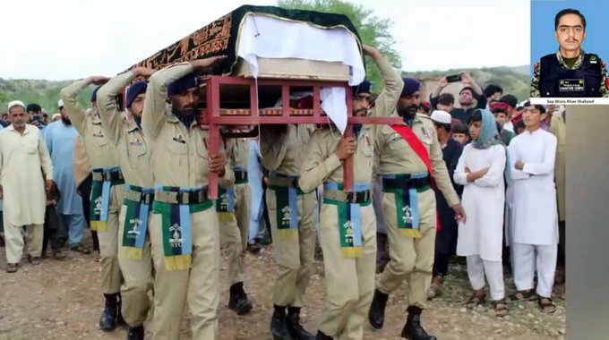 راولپنڈی : سپاہی وارث خان شہید کو اپنے آبائی علاقےمیں مکمل فوجی اعزاز کے ساتھ سپرد خاک کردیا گیاشعبہ تعلقات عامہ (آئی ایس پی آر) کے مطابق سپاہی وارث خان شمالی وزیرستان کے علاقے میران شاہ میں دہشتگردوں کے ساتھ شدید فائرنگ کے تبادلے میں شہید ہوئے گئے تھے۔ شہیدکی نماز جنازہ میں فوجی افسران، جوان ،رشتہ داروں اور اہل علاقہ کی بڑی تعداد نے شرکت کی۔ شہید سپاہی وارث خان نے سوگواران میں بیوہ، 2 بیٹے اور والدین چھوڑے ہیں۔