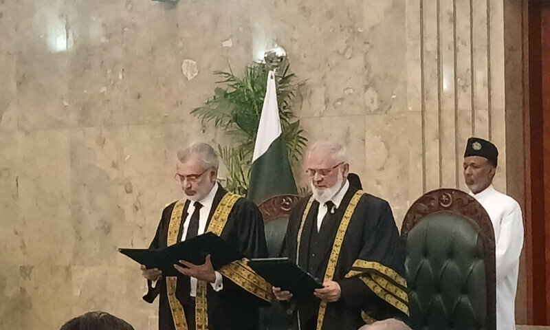 اسلام آباد: سپریم کورٹ کے جج جسٹس عرفان سعادت نے اپنے عہدے کا حلف اٹھا لیا۔چیف جسٹس آف پاکستان قاضی فائز عیسیٰ نے جسٹس عرفان سعادت سے عہدے کا حلف لیا۔تقریب حلف برداری سپریم کورٹ ہال میں منعقد ہوئی جس میں سپریم کورٹ کے تمام جج صاحبان، اٹارنی جنرل اور وکلا شریک ہوئے۔واضح رہے کہ جسٹس عرفان سعادت سندھ ہائیکورٹ کے چیف جسٹس تھے، جسٹس عرفان سعادت کی تقرری کے بعد سپریم کورٹ میں جج صاحبان کی تعداد 16 ہو گئی ہے۔ واضح رہے سپریم کورٹ کے کل 18 ججز میں سے اس وقت بھی ایک جج کی نشست خالی ہے۔