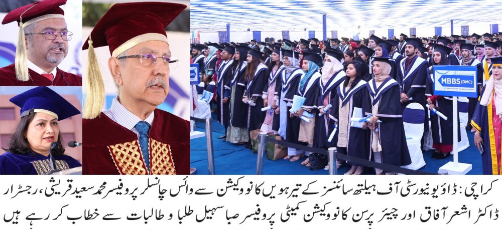 کراچی:ڈاؤ یونیورسٹی آف ہیلتھ سائنسز کے تیرہویں کانووکیشن میں ایم بی بی ایس، بی ڈی ایس ،فارم ڈی اور ڈی پی ٹی سمیت الائیڈ ہیلتھ سائنسز اکیس سو بانوے طلبہ و طالبات کو ڈگریاں تفویض کردی گئیں کانووکیشن کا انعقاد اوجھا کیمپس کرکٹ اسٹیڈیم میں کیا گیا تھا جس کے مہمان خصوصی وائس چانسلر پروفیسر محمد سعید قریشی تھے۔انہوں نے اپنے خطاب میں کہا کہ ڈاؤ یونیورسٹی کا شمار دنیا کی چھ سو بہترین یونیورسٹیوں میں ہوتا ہے یہ ہم سب کی محنت کا نتیجہ ہے۔ طلبہ سے خطاب میں پروفیسر محمد سعید قریشی نے کہا کہ ایم بی بی ایس اور بی ڈی ایس گریجویشن کیلیے ڈاؤ یونیورسٹی طلبا و طالبات کی ہمیشہ سے ترجیح ہے۔ سیکھنے کا عمل مستقل مرحلہ ہے، یہ آپ کیلئے ایک جذباتی دن بھی ہے اور آپ کے خاندان کیلئے فخر و افتخار بھی ہے میرے لئے بھی یہ امیدوں سے بھرپور دن ہے ۔انہوں نے کہا کہ آپ کی تعلیم مکمل ہوگئی ہے اپنے تعلیمی شعبہ میں کمال حاصل کیجیئے ،ہماری کوشش رہی ہے کہ آپ کو تعلیم کے ساتھ ساتھ اخلاص، برداشت سمیت دیگر اخلاقی اوصاف بھی سکھائے جائیں ۔اب دنیا آپ کے سامنے ہے آپ اپنے علم سے انسانیت کی خدمت کیجیئے۔
