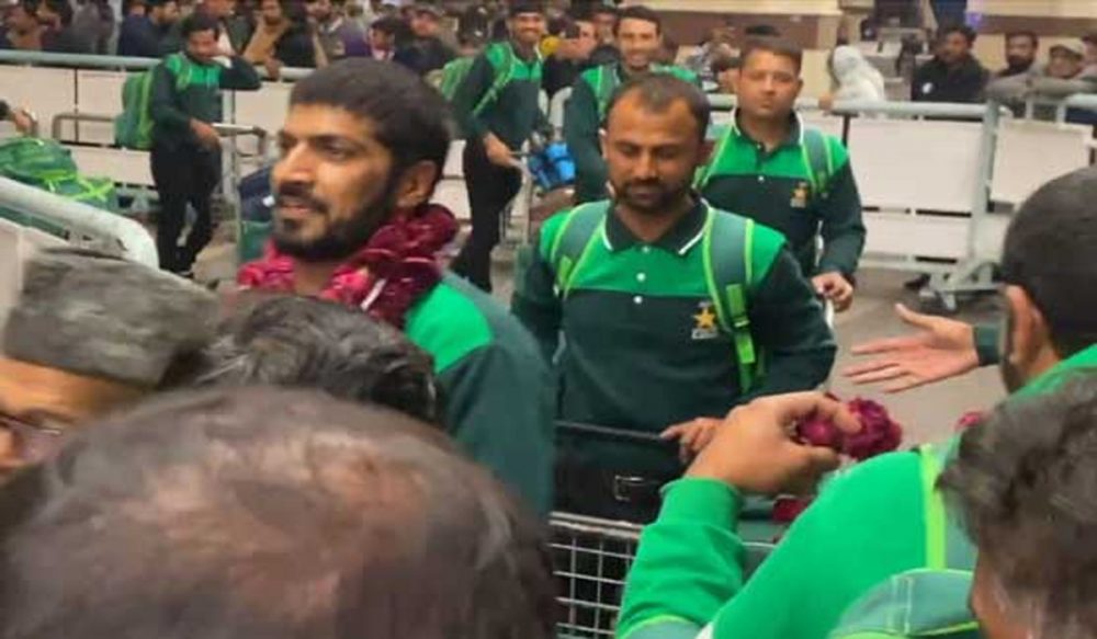 پرواز لاہور کے علامہ اقبال انٹرنیشنل ایئرپورٹ پہنچے جہاں پر پی سی بی حکام کی جانب سے استقبال کیا گیا