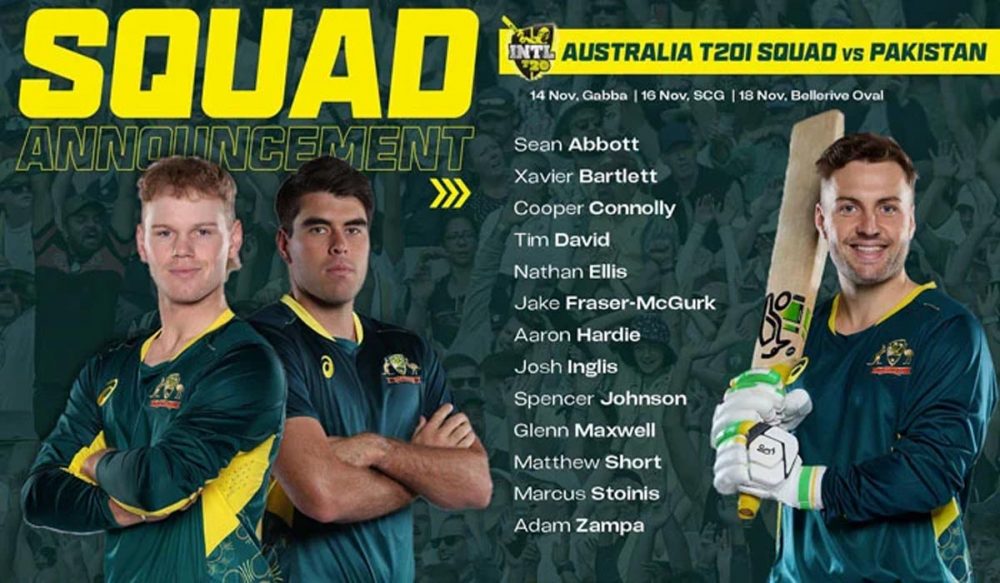 پاکستان کے خلاف ٹی ٹوئنٹی سیریز میں گلین میکسویل، مارکوس اسٹوئنس ایڈم زمپا اور میتھیو شارٹ اسکواڈ کا حصہ ہیں۔