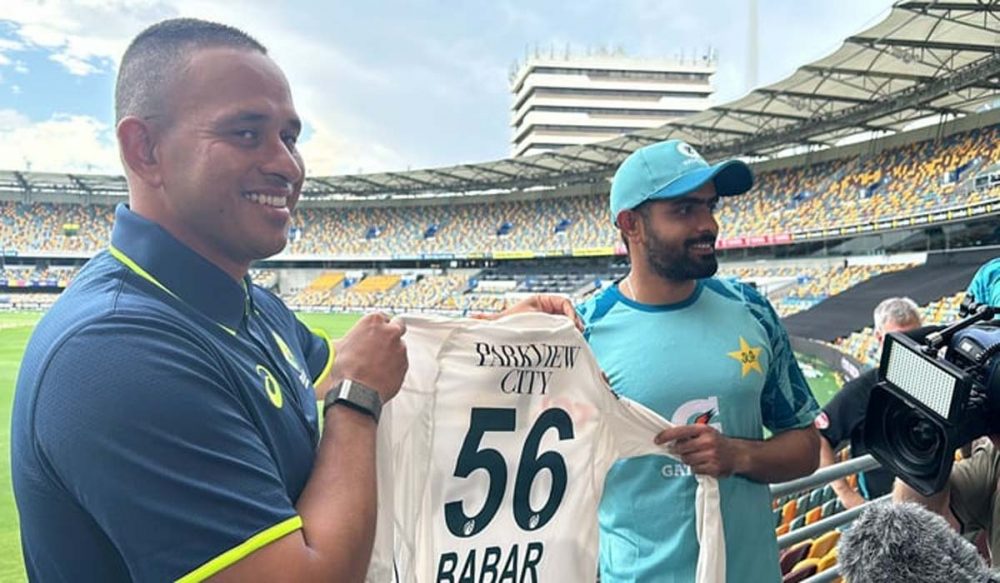 برسبین میں سابق کپتان بابر اعظم نے آسٹریلوی کرکٹر عثمان خواجہ کو اپنی شرٹ خواجہ فاؤنڈیشن کے لیے دی۔
