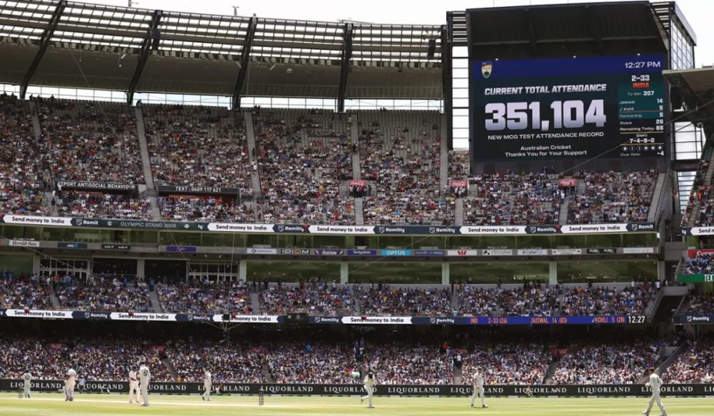 بھارت اور آسٹریلیا کے درمیان جاری چوتھے ٹیسٹ میچ میں حاضری کا ایک نیا ریکارڈ قائم ہو گیا جس کے دوران 5 روز میں میلبرن کرکٹ گراؤنڈ (ایم سی جی) میں 3 لاکھ 50 ہزار 700 سے زیادہ شائقین میدان میں آئے۔