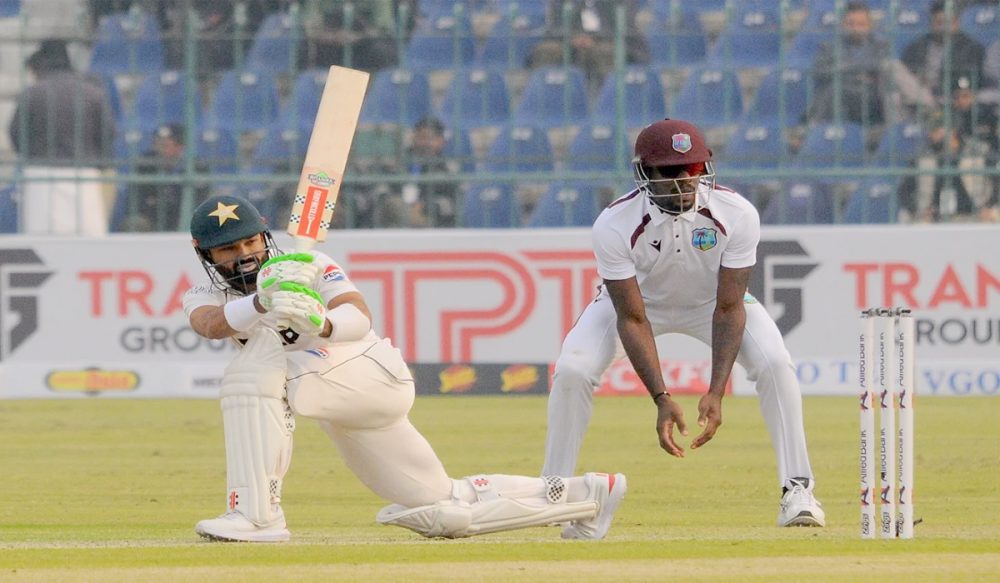 پاکستان ٹیم کی جانب سے سعود شکیل اور محمد رضوان نے پہلی نا مکمل اننگ کا دوبارہ آغاز کیا۔