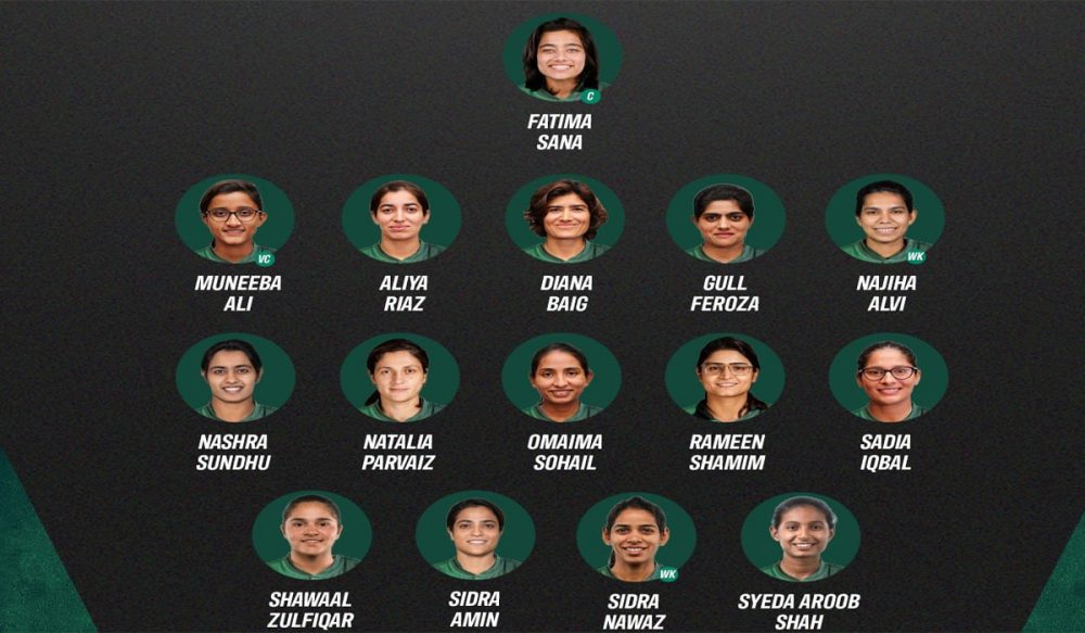فاطمہ ثنا (کپتان) منیبہ علی (نائب کپتان)، عالیہ ریاض، ڈیانا بیگ، گل فیروزہ، نجیہہ علوی (وکٹ کیپر) نشرہ سندھو، نتالیہ پرویز، عمیمہ سہیل، رامین شمیم، سعدیہ اقبال، شوال ذوالفقار ۔ سدرہ امین۔ سدرہ نواز ( وکٹ کیپر ) اور سیدہ عروب شاہ۔