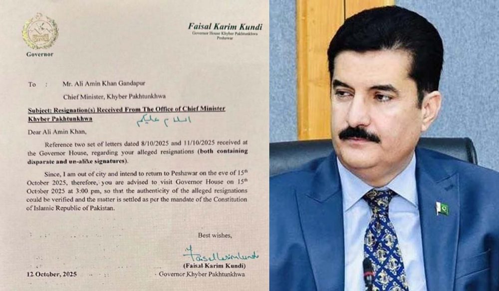 گورنر نے استعفوں کی تصدیق کے لیے علی امین گنڈا پور کو 15 اکتوبر کو دوپہر 3 بجے گورنر ہاؤس طلب کرلیا ہے۔