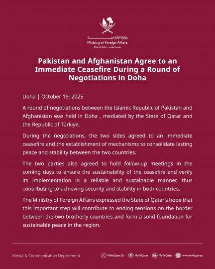 قطر کی وزارت خارجہ نے بھی ایک بیان جاری کیا جس میں سیز فائر معاہدے کا اعلان کیا گیا ہے۔ بیان کے مطابق فریقین نے اتفاق کیا کہ وہ پائیدار امن کے لیے میکنزم تشکیل دیں گے اور بات چیت جاری رکھی جائے گی۔