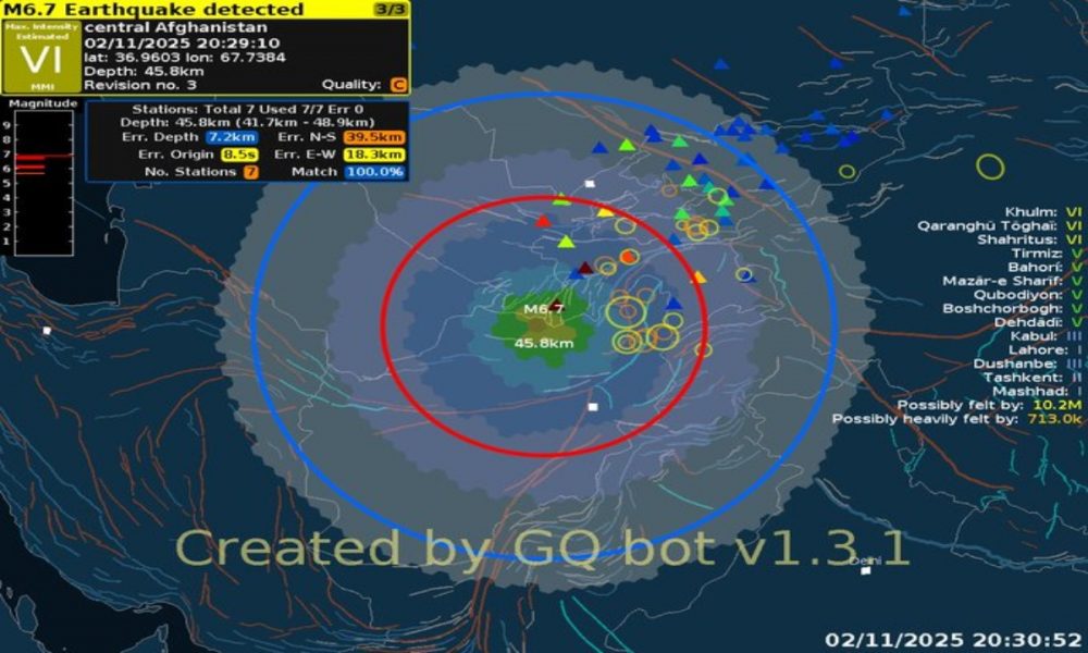 زلزلے کی شدت 6.3 ریکارڈ کی گئی، گہرائی 28 کلومیٹر تھی، جبکہ مرکز صوبہ سمنگان کے ضلع خُلم سے تقریباً 22 کلومیٹر جنوب مغرب میں واقع تھا۔