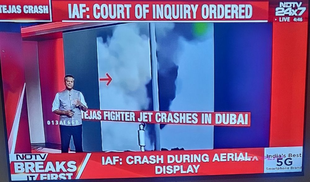 تیجس لڑاکا جہازفضائی مظاہرے کے دوران گرا۔ جائے حادثہ سے سیاہ دھواں اٹھتا ہوا دیکھا گیا