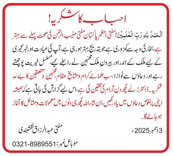مفتی عبدالرزاق نقشبندی نے مفتی منیب الرحمن کی عیادت اور خبر گیری کرنے والے احباب سے اظہار تشکر کیا اور کہا کہ ہمشیہ اپنی پر خلوص دعائوں میں یاد رکھیں۔