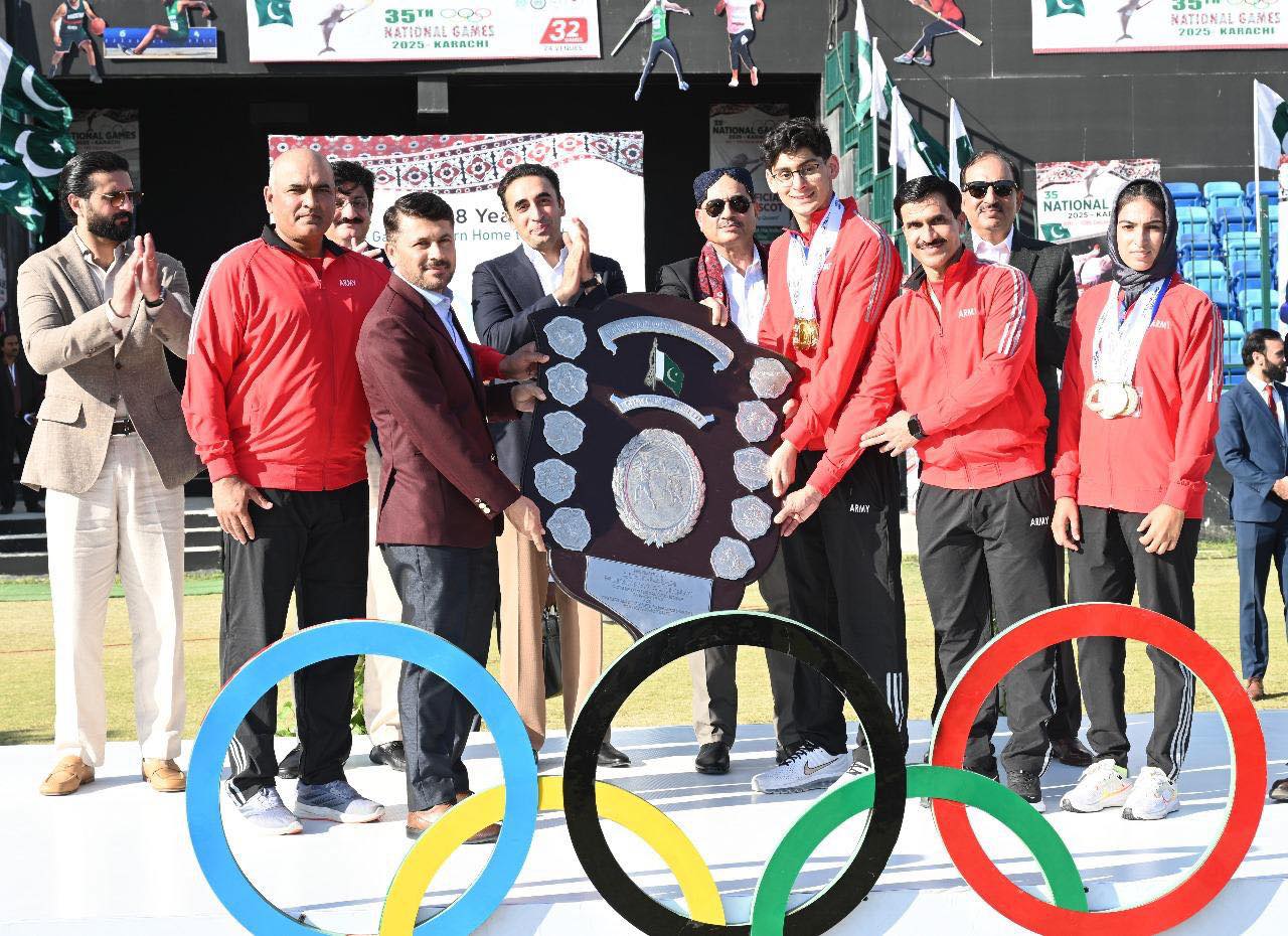 کراچی میں 35ویں نیشنل گیمزکی اختتامی تقریب نیشنل بینک اسٹیڈیم میں منعقد ہوئی، جس میں چیف آف آرمی سٹاف اور چیف آف ڈیفنس سٹاف فیلڈ مارشل عاصم منیر مہمان خصوصی تھے۔اس موقع پرچیئرمین پیپلز پارٹی بلاول بھٹو نے فیلڈ مارشل عاصم منیر کو سندھی اجرک اور ٹوپی کا روایتی تحفہ بھی پیش کیا۔