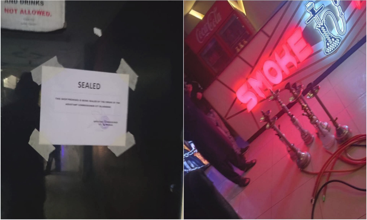 اسلام آباد کی ضلعی انتظامیہ نے غیرقانونی انڈور شیشہ کیفوں کے خلاف کریک ڈاؤن کرتے ہوئے بحریہ ٹاؤن کے سِوک سینٹر، سوہان میں قائم تین کیفے سیل کر دیے۔