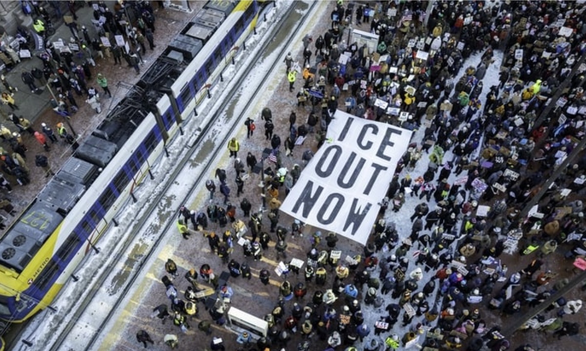 احتجاج کا نعرہ تھا: "کوئی کام نہیں، کوئی اسکول نہیں، کوئی خریداری نہیں، آئی سی ای کی فنڈنگ بند کرو۔”