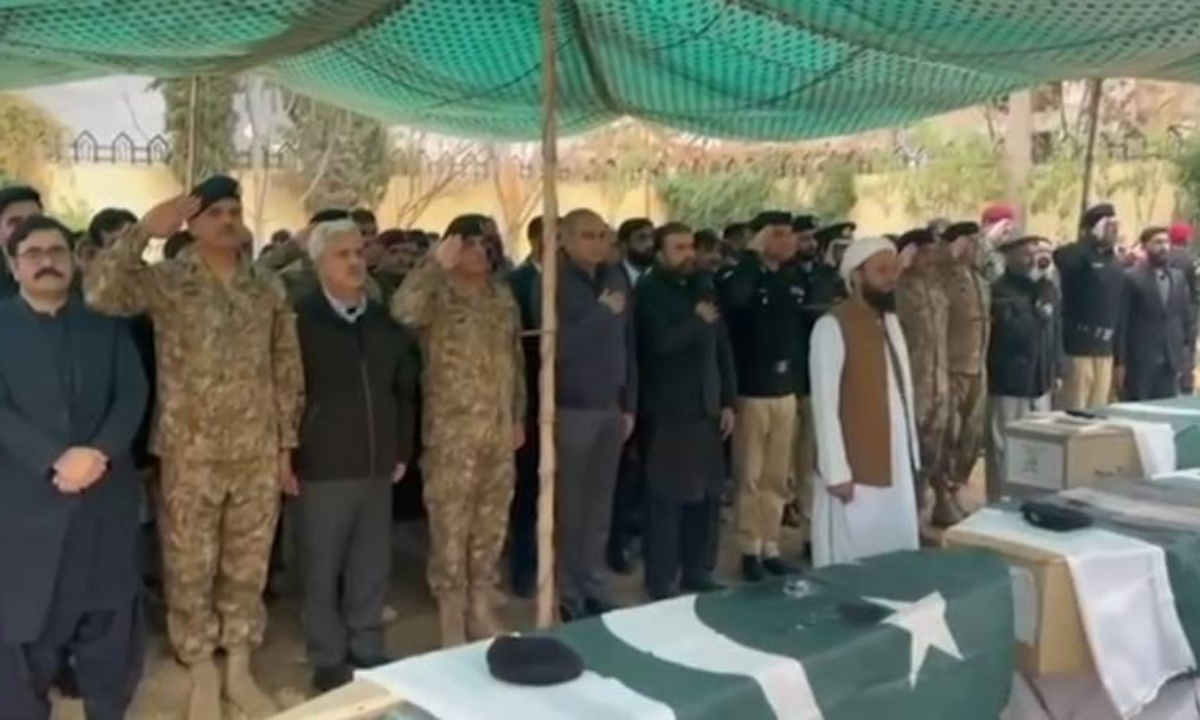 بلوچستان میں دہشت گردوں کو ناکام بناتے ہوئے شہید ہونے والے پولیس اہلکاروں کی نمازِ جنازہ ادا کر دی گئی۔ جنازہ میں وفاقی وزیر داخلہ محسن نقوی، وزیر اعلیٰ بلوچستان میر سرفراز بگٹی، کور کمانڈر بلوچستان، صوبائی وزراء، اراکین اسمبلی، آئی جی پولیس بلوچستان، پولیس کے اعلیٰ حکام اور دیگر اہلکار بڑی تعداد میں شریک ہوئے۔