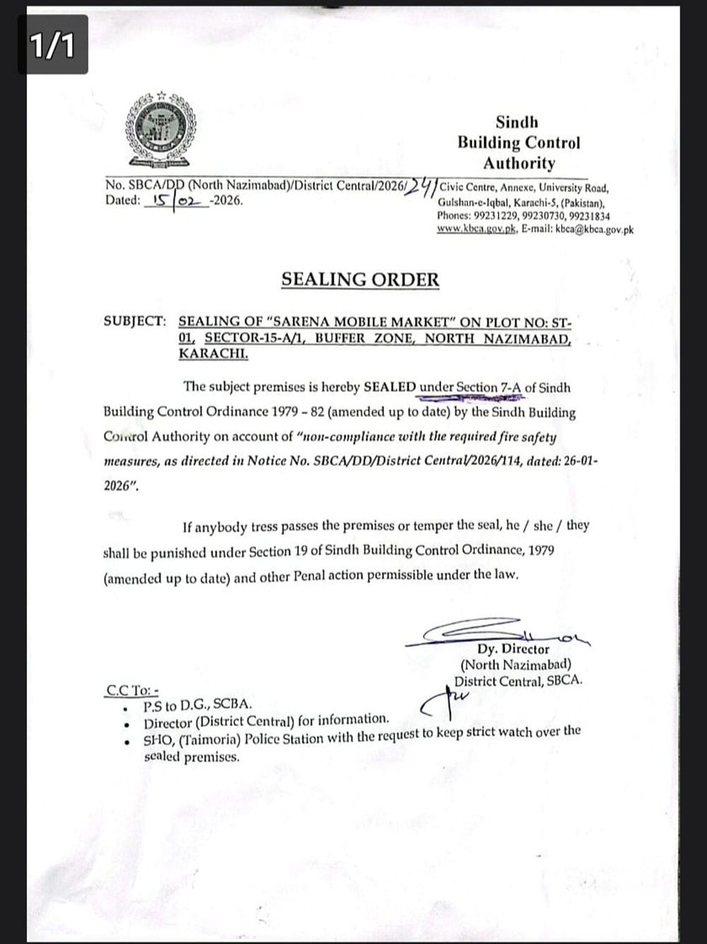 سرکاری نوٹس کے مطابق حالیہ دنوں میں شہر کی بلند و بالا عمارتوں اور تجارتی مراکز میں آتشزدگی کے بڑھتے ہوئے واقعات کے پیشِ نظر تمام مارکیٹوں کا سیفٹی آڈٹ کیا جا رہا ہے۔ حکام کا دعویٰ ہے کہ سرینا موبائل مارکیٹ کو پہلے بھی متعدد بار نوٹسز جاری کیے۔