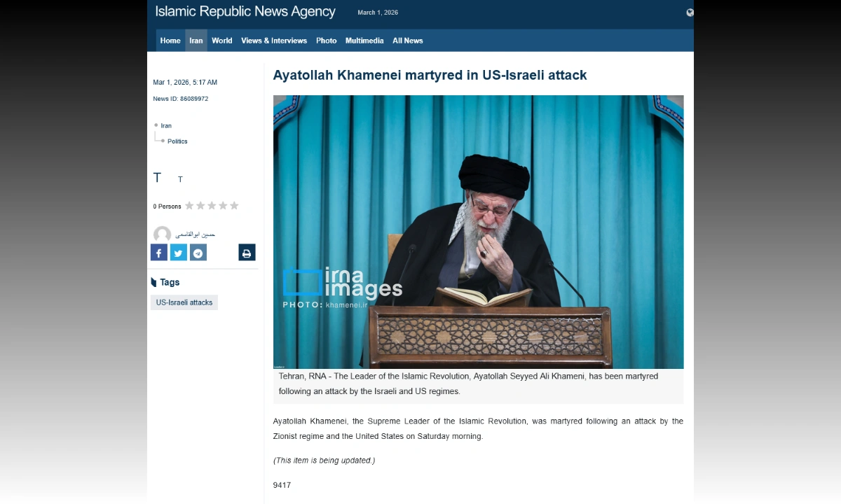 ایران کی سرکاری نیوز ایجنسی سے آیت اللہ خامنہ ای کی شہادت کا اعلان