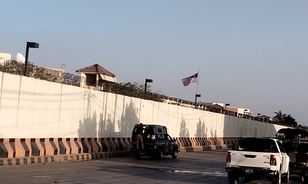کراچی میں اتوار یکم مارچ 2026 کو امریکی قونصل خانے کی تصویر جب مظاہرین واپس جا چکے تھے --- تصویر اختر نواز
