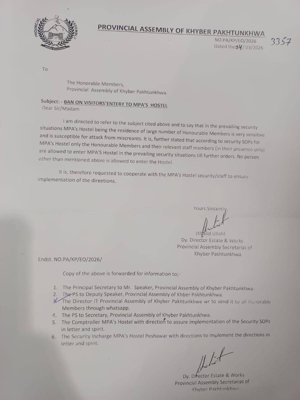 اسمبلی سیکرiٹریٹ اور ڈپٹی ڈائریکٹر اسٹیٹ اینڈ ورکس کی جانب سے جاری کردہ ہدایات کے مطابق ہاسٹل کی حدود میں صرف منتخب ارکانِ اسمبلی اور ان کا مجاز متعلقہ عملہ ہی داخل ہو سکے گا۔