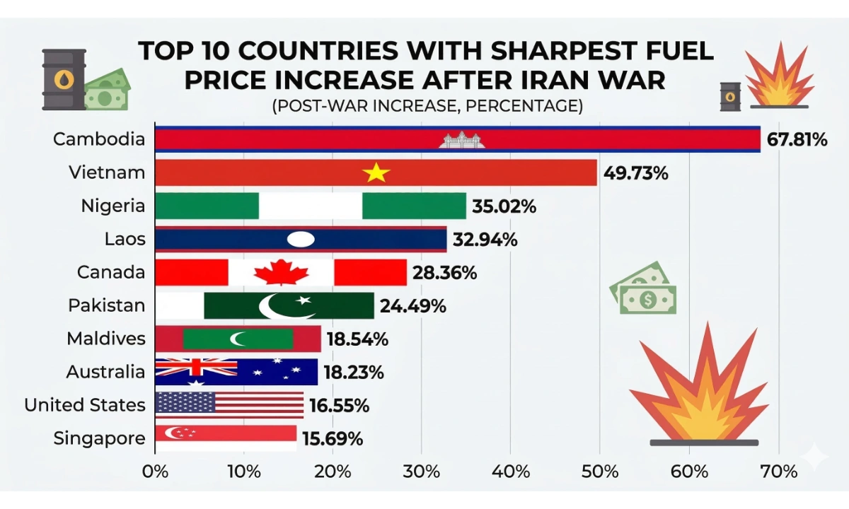 اعداد و شمار کے مطابق کمبوڈیا میں پیٹرول کی قیمتوں میں سب سے زیادہ تقریباً 67.8 فیصد اضافہ ریکارڈ کیا گیا جبکہ ویتنام میں 49.7 فیصد، نائیجیریا میں 35 فیصد اور لاؤس میں 32.9 فیصد اضافہ دیکھنے میں آیا۔