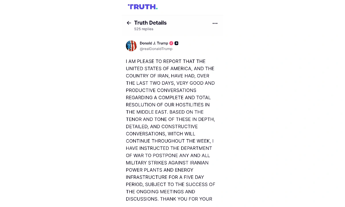 ان کے مطابق ان تفصیلی اور تعمیری مذاکرات کے تناظر میں انہوں نے امریکی محکمہ دفاع کو ہدایت دی ہے کہ ایران کے پاور پلانٹس اور توانائی کے بنیادی ڈھانچے پر مجوزہ تمام فوجی حملے پانچ دن کے لیے مؤخر کر دیے جائیں، جبکہ اس دوران مذاکرات کا سلسلہ جاری رہے گا۔