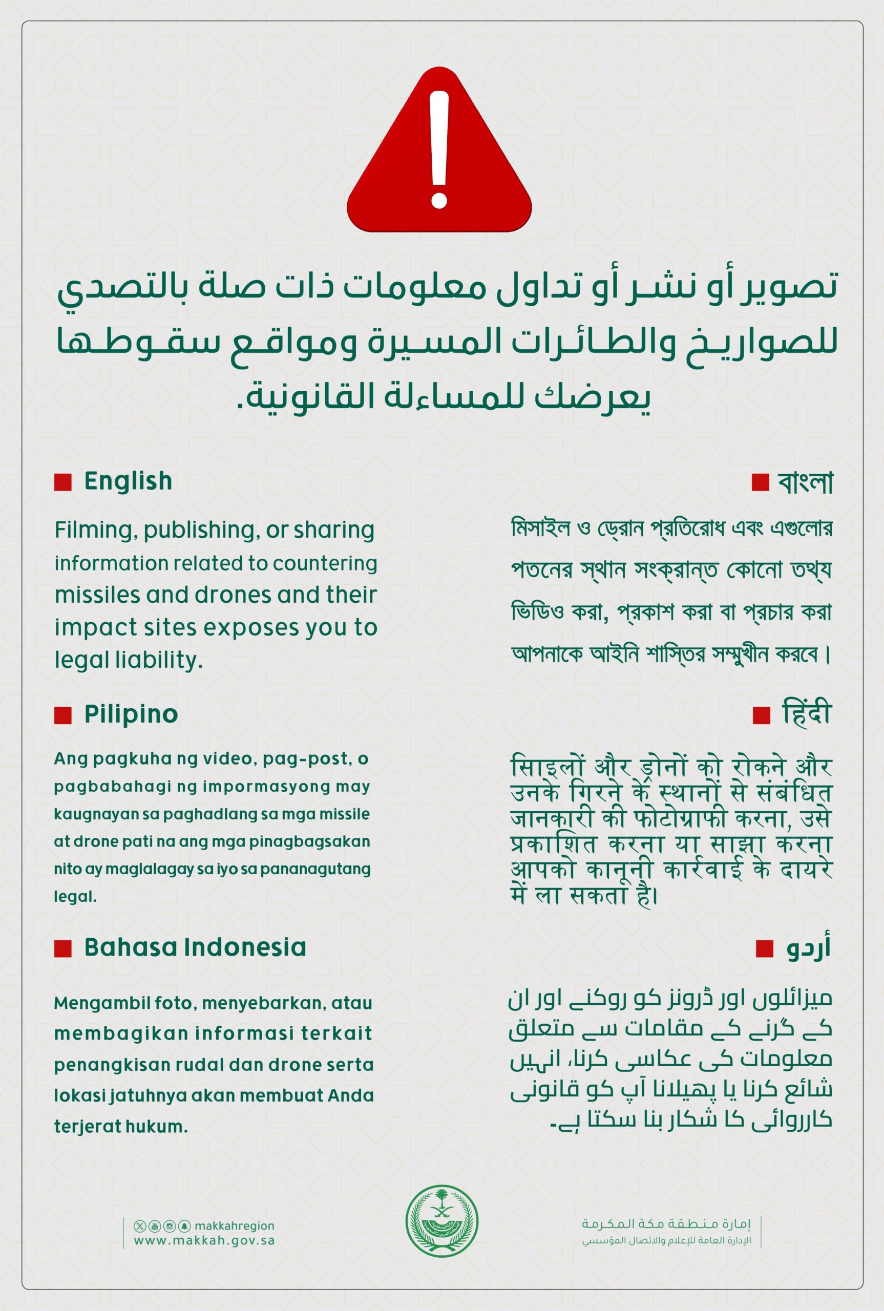 سعودی حکام نے عوام سے اپیل کی ہے کہ حساس سیکیورٹی معلومات کو محفوظ رکھیں اور کسی بھی قسم کی فلمنگ یا شیئرنگ سے گریز کریں، کیونکہ اس سے دشمن کو اہم معلومات حاصل ہو سکتی ہیں جو مستقبل میں حملوں کے لیے استعمال ہو سکتی ہیں۔