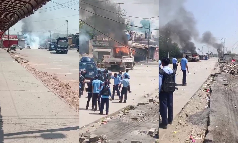 کشیدگی اس وقت عروج پر پہنچ گئی جب مشتعل مظاہرین نے انتظامیہ کی دو سرکاری گاڑیوں کو آگ لگا دی۔ آگ کے شعلے اور دھویں کے بادل دور دور سے دیکھے گئے جبکہ بھگدڑ مچنے سے علاقے میں شدید خوف و ہراس پھیل گیا۔