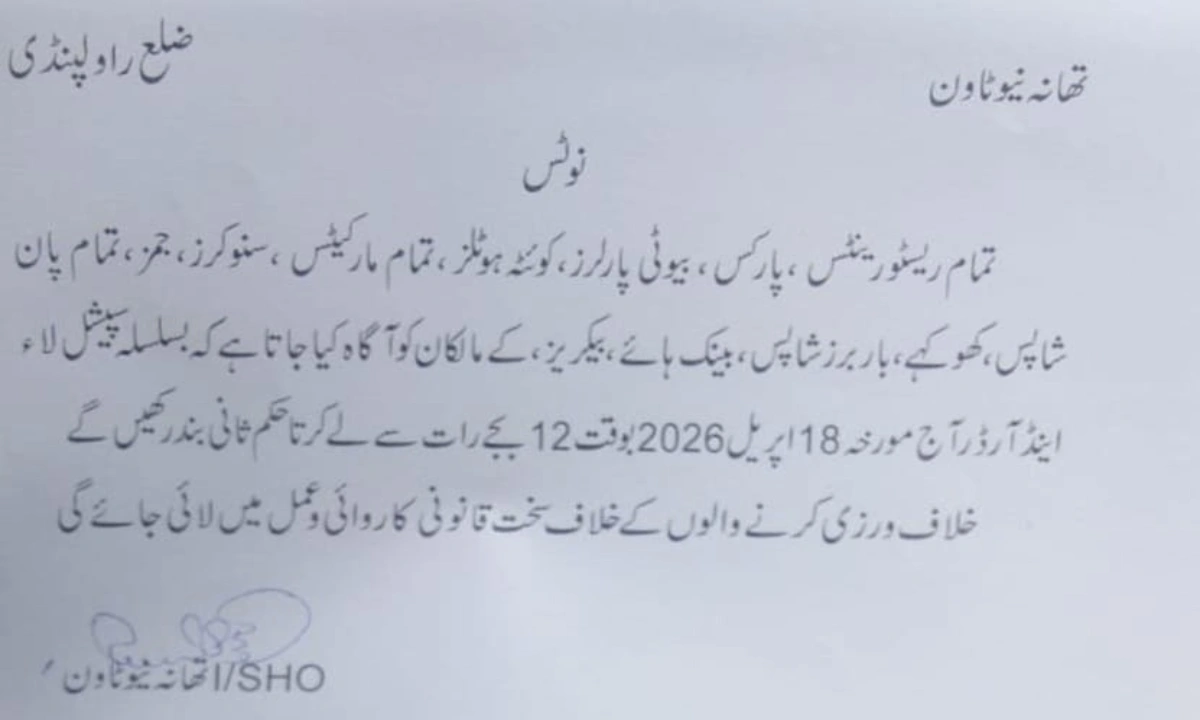 “تمام ریسٹورینٹس، پارکس، بیوٹی پارلرز، کوئٹہ ہوٹلز، تمام مارکیٹس، سنوکرز، جمز، تمام پان شاپس، کھوکھے، باربرز شاپس، بینک ہائے و بیکریز کے مالکان کو آگاہ کیا جاتا ہے کہ بسلسلہ اسپیشل لاء اینڈ آرڈر آج مورخہ 18 اپریل 2026 بوقت 12 بجے رات سے لے کر تا حکم ثانی بند رکھیں گے۔ خلاف ورزی کرنے والوں کے خلاف سخت قانونی کارروائی عمل میں لائی جائے گی۔