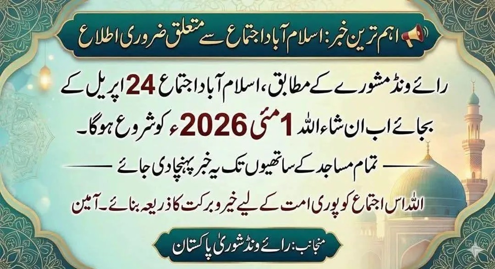 ترجمان رائے ونڈ شوریٰ پاکستان کی جانب سے جاری کردہ حالیہ اطلاع کے مطابق، اسلام آباد اجتماع جو پہلے 24 اپریل سے شروع ہونا تھا، اب وہ ان شاء اللہ یکم مئی 2026ء کو شروع ہوگا۔