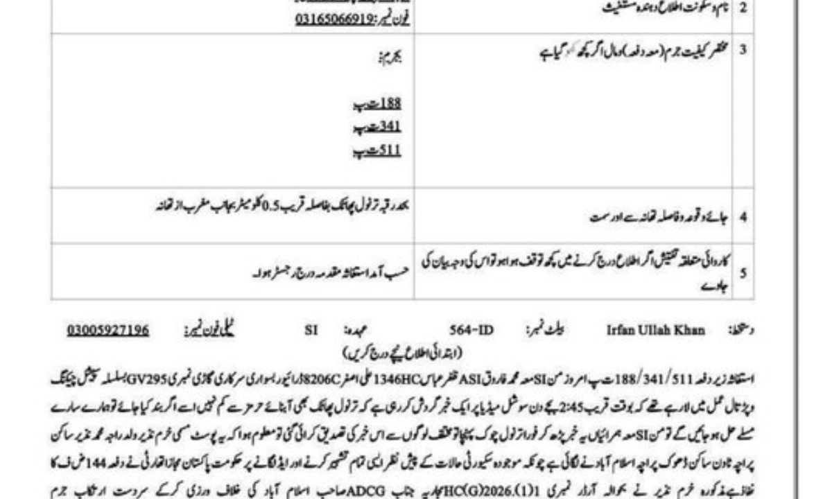 ایف آئی آر کے مطابق موجودہ سکیورٹی صورتحال کے پیش نظر مجاز اتھارٹی کی جانب سے دفعہ 144 نافذ ہے، جس کے باوجود ملزم نے عوام کو پھاٹک بند کرنے پر اکسانے کی کوشش کی۔