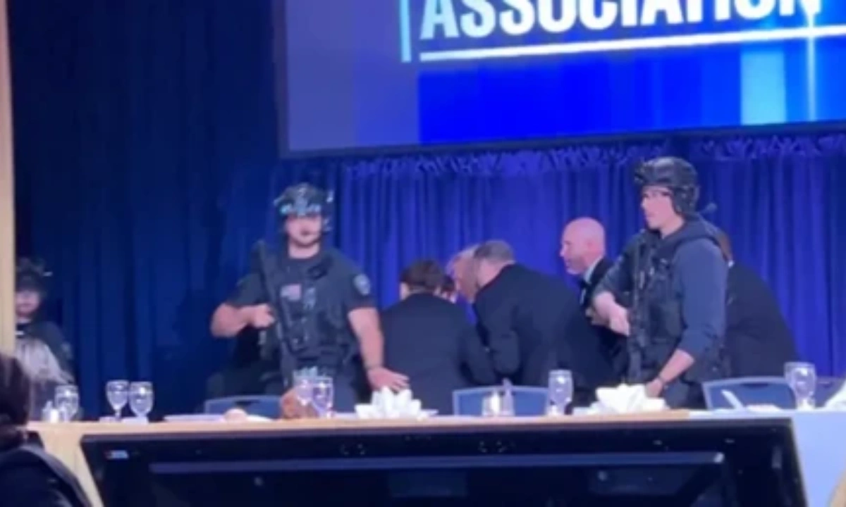 وائٹ ہاؤس میں میڈیا نمائندوں کے اعزاز میں دیے گئے عشائیہ کے دوران مبینہ فائرنگ کی آواز کے بعد سیکورٹی اہلکار امریکی صدر ڈونلڈ ٹرمپ کو ہال سے باہر لے گئے۔