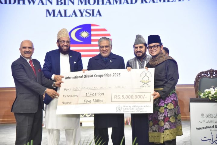 عالمی مقابلہ حسن قرات میں ملائشیا فاتح،پاکستان کی تیسری پوزیشن November 29, 2025 ایمن رضوان اول انعام کے حقدارقرار۔ایران کا دوسرا نمبر پر۔کنونشن سنٹر اسلام آبادمیں تقسیم انعامات