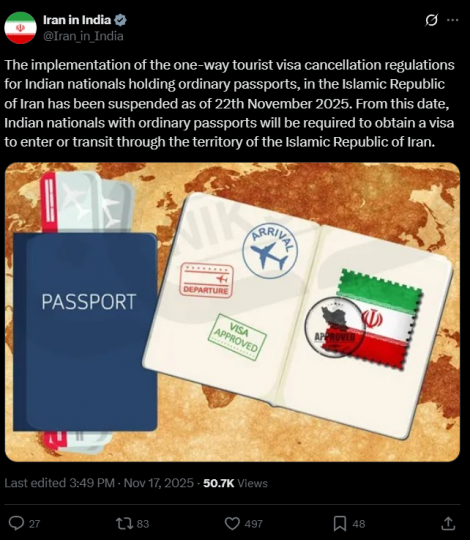 بھارت کے لیے ایران کا ویزہ فری سفر کیوں ختم کیاگیا؟ November 20, 2025 22 نومبر سے داخلے اور ٹرانزٹ دونوں کے لیے پیشگی ویزا حاصل کرنا ہوگا