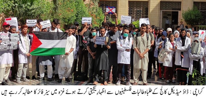 ڈاؤ میڈیکل کالج کے طلباء کا غزہ میں جنگ بندی کا مطالبہ November 10, 2023 مظلوم فلسطینیوں تک فوری طور پر دوائیں اور امداد پہنچائی جائے، طلباء