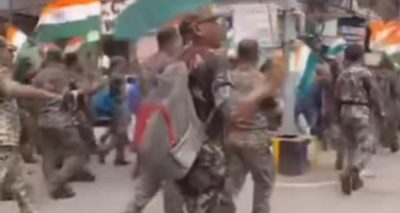 اہلکاروں نے وردی پہن کر حکومت کے خلاف نعرے بازی کی اور ہاتھوں میں بھارتی جھنڈے اٹھا رکھے تھ