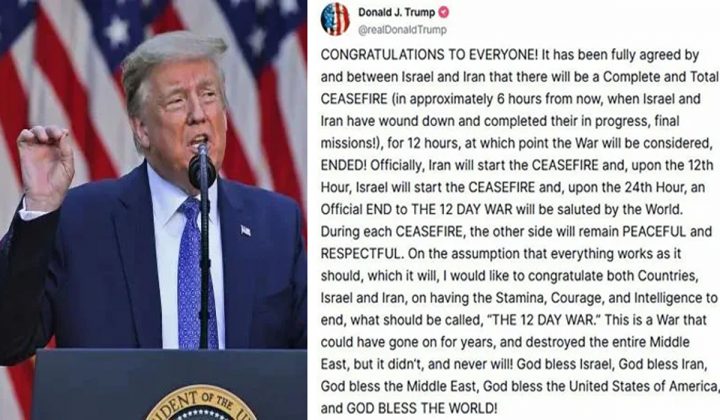 ایران اور اسرائیل نے جنگ بندی پر اتفاق کرلیا June 24, 2025 24 گھنٹے بعد 12دن کی جنگ مکمل ختم ہوجائے گی، ہر فریق کی جنگ بندی کے دوران دوسرا فریق پرامن…