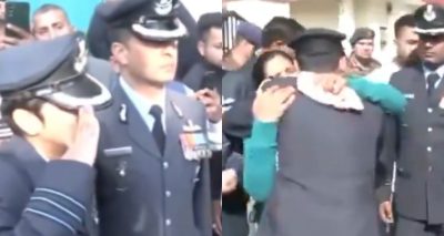 ان کی اہلیہ، جو خود بھارتی فضائیہ میں حاضر سروس افسر ہیں، آخری رسومات میں شدید غم سے نڈھال دکھائی دیں